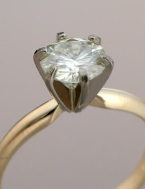 This close-up shows the prongs formed over the crown of the gemstone. Hoover & Strong has removed about 40 percent of the prongs depth for the bearing in the manufacturing process. The gemstone is securely seated in the bearing and the prongs after forming and the prongs are flush with the crown of the gemstone. Finally, shape the prongs and polish.
