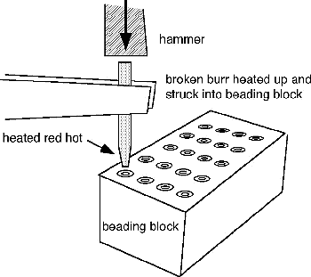 Setters use old burrs to make different sizes of beading tools using a steel beading block. The tools are used to round off the beads for pavé set gems. This rather antique approach to toolmaking is great for maintaining a set of varied sizes of beading tools. The beading block tool is expensive, maybe $70.00 or so. To use it you take an old burr, snap the burr itself off using a pair of pliers, grind the point off flat, then heat the end up red hot and hammer it swiftly and once into the beading block hole you want. If it is not yet formed properly reheat and do it again. The beading block will have rows of the same size of holes to form the beading tool. This is because the heat damages the shaping holes with time and so having more than one to replace those worn out is useful. When the burr has been reshaped properly into a beading tool then it is hardened and tempered to a straw yellow color on the tip. Finally it is lightly polished.