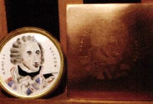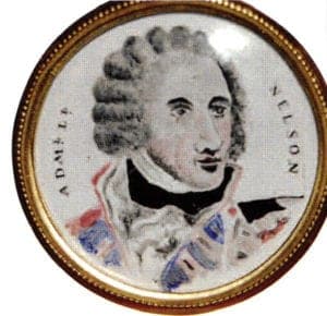 The copper medallion, two inches across (5.08 cm), was slightly domed, and coated on both sides with high firing white enamel (Pic. 5). The transferred monochrome image, produced and applied as described below, was fused briefly at medium temperature and completed with prepared oxides as for standard painting on enamel. This took altogether five firing stages. This contemporary Nelson portrait is a single demonstration piece, but of course, in the past, for commercial production of transferred images (with prevailing processes), each such intricately engraved copper plate served for up to 200 transfers to enamel, notably for ornamenting display pieces in the genre of English enamels.