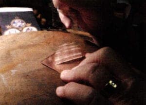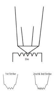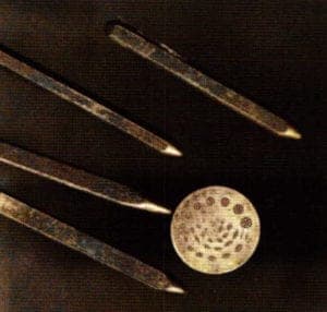 Alan had served a two year apprenticeship in die sinking [such as needed for example in the making of badges]. Picture 9 shows the working end of a die, one inch across. Several groups of indents are worked into this polished surface of the die and individual punches can be made from these. The die is formed from annealed steel, (which softens the metal) allowing the indents to be sunk in, and it is then hardened by heat treatment. The punches, made from annealed steel rods of about 3 inches long, are prepared with cone-shaped ends: each punch is then made by tapping over the selected pattern in the die, to give the raised pins, and it is then hardened. The diagram in picture 10 (see previous page) indicates the main stages of preparing such a punch. The punch, with the selected patterning of raised pins is then ready to be tapped over the copper plate using a chasing hammer (Pic. 11), to produce the design (Pic. 12).