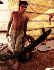 The next day we visited the Sean Lae mine, south of Ban Lung. We had three flat tires along the way. Several hours were spent pushing the motorcycle along dusty jungle paths, so it gave me a chance to more closely observe rural life in Ratanakiri. After the third flat, I sat on a rock while Hao soaked the tube in a pan of water, trying to find the leak. A young mother and three naked little boys squatted on their haunches offering advice. Chickens pecked in the dirt, and a skinny dog lay basking in the sun. I asked her if she or her husband did any mining.