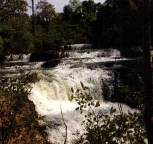 However, when at last we reached the current gemstone village, it actually seemed more lived-in and permanent than the one at Bokeo. The wooden houses were built on poles, with living quarters above and livestock underneath. There was a small café and a school. This village was near a gorgeous waterfall, Seven Step Falls, which cascades over seven large boulders into a crystal pool at the base. Unlike the Bokeo mine, which is an alluvial mine where the miners sift through the dirt in search of the zircon, Sean Lae is a placer mine that gets its water from the falls.