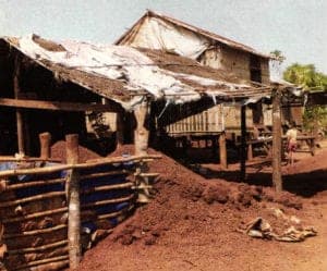 With the tire repaired, we moved on to Sean Lae. This area is one of the most heavily mined areas in the region. We passed chasms of scarred and blackened earth that reminded me of a dead planet. Deserted homes lay tumbled in forlorn heaps. I felt like we were passing through a land of ghosts.