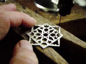 Make a pair of earrings by using 950 alloy from 0.90 mm sheet silver. Cut out the design internally so that the openings are not more than 5mm in length, and at least 3mm from the metal edge and having a minimum distance of 1.5mm between openings. These measurements are necessary in order to guarantee a sturdy silver frame and to prevent the enamel from cracking.