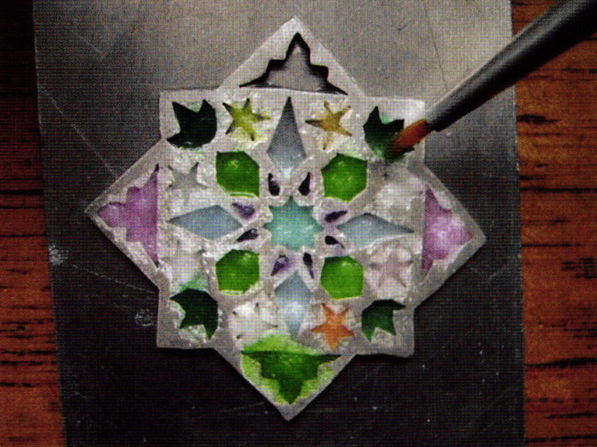 Place the sawn out silver pieces on a titanium sheet and apply wet enamel in light colors using a number 0 brush. The silver sheet and the titanium sheet must be very smooth and they must lay in close contact with one another. Be careful that the enamel is not too wet during application so that the enamel and water will not run under the piece. Titanium is used in this technique because enamel will not adhere to its surface.