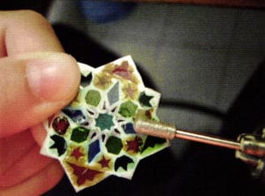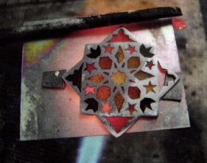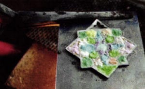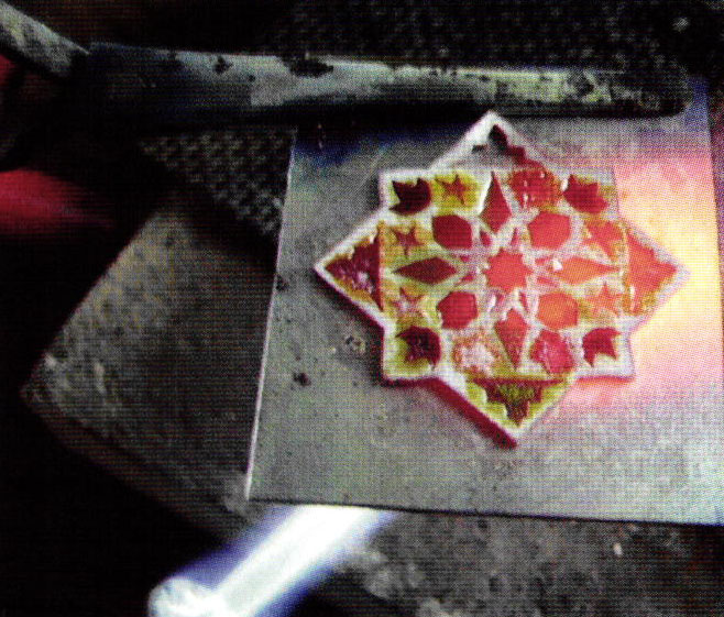 Handle the titanium sheet by picking it up with a 'third hand' tweezers and be careful that the silver and enamel do not move on the titanium sheet. Heat up the titanium underneath by using the torch, first with candle flame (partially closing the air valve) and then with the hard flame, since it is necessary to have much heat for the enamel to soften.