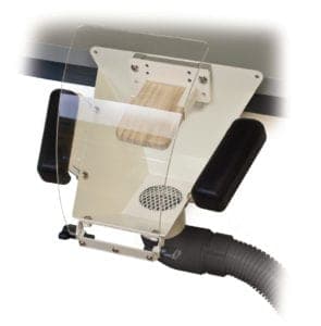 Featuring a curved acrylic shield and adjustable armrests, the Fishmouth with bench pin can be mounted to benches with a GRS style mounting bracket. It has an exhaust port that accommodates a 2.25 inch hose and comes with an elbow to position the dust collector in any direction. The acrylic shield gives users a clear view of the work and helps keep stray dust from flying toward them. With a mounting bracket for the supplied wooden bench pin assembly, the Fishmouth measures 8.75 inches deep by 9 inches high and tapers from 6 inches in the front to 9.5 inches in the back. Contact: Foredom Electric Co., 16 Stony Hill Road, Bethel, CT 06801; 1-203-792-8622; fax 203-796-7861; e-mail customerservice@blackstoneind.com; foredom.net.