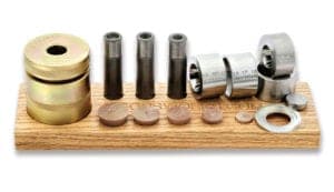 Designed to streamline the process of creating rings from minted coins, the Jason's Works Coin-Ring Starter Kit features a holder, punches, dies, spacers, and reduction dies that can accommodate quarters, half-dollars, and Morgan dollars. Users begin by punching a hole in a coin with a punch, die pair, and a spacer that centers the punch. Then, using a Durston vertical ring stretcher and a succession of reduction dies, the coin is folded outward to form and shape a coin ring, with all the coin details intact. The kit comes with a red oak wooden organizer to hold the tools. Contact: Rio Grande,