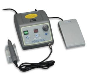 Featuring a torque type handpiece, the Forte100 is a desktop, brushless micromotor designed to increase work efficiency while reducing vibration and noise. With a foot pedal control, the micromotor has a maximum rpm of 50,000 and a torque of 7.8 N.cm. Ergonomically designed, the unit has a built-in microprocessor for self-diagnosis, error display, and work memory storage. Contact: A&A JEWELRY SUPPLY, 319 W. 6th St., Los Angeles, CA 90014; 1-213-627-8004; fax 627-1653; e-mail info@aajewelry.com; aajewelry.com.