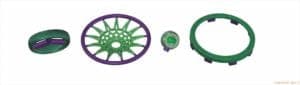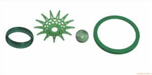 Techform agreed with Klecka's separation of the elements—the ring band, net, basketball, and outer rim. In the outer rim, the top and side met at a 90-degree angle, and each had 0.7-0.8 mm deep debossed lettering. The Techform team recommended that for casting in palladium, he reduce the lettering to a depth of 0.4 to 0.5 mm, with 0.5 mm their recommended maximum. "When molten metal enters the mold and there's an unstable investment condition created by deep blind recesses surrounding the letters, it can blow out the features," says Fryé. "The strength of the investment is just too low to withstand the force, so you will have a combination of molten metal mixed with investment, and that's a very bad combination."