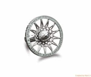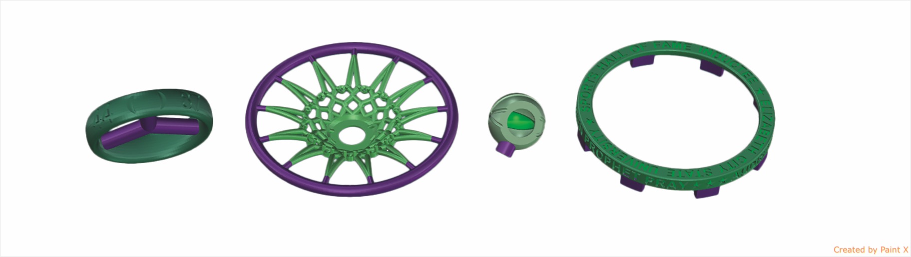 As he finalized the design, he knew the ring would need to be broken into components for casting. But, he says, the components "had to be keyed to each other so that when it came time for the jeweler to put [the ring] together, they would fit properly and nothing would overlap the lettering." Recognizing that success comes more easily with good communication, Klecka proactively sent his rendering to Teresa Fryé, owner of Techform Advanced Casting in Portland, Oregon, to get her input on castability and sprueing, something that Fryé appreciates because it helps ensure optimum results.