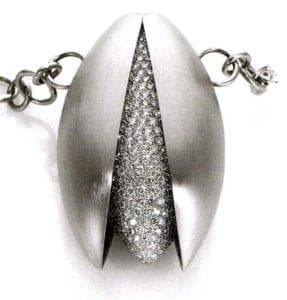 W. Schäfer: Primarily speaking, platinum is a modeling material. Casting work is possible with the cobalt alloy, but it's tricky. The excellent catalytic properties mean that gold can be combined with platinum without flux or solder. Using a laser is also easy. In view of the fact that platinum does not change its form, i.e. does not expand or contract if the temperature changes - this is why the original meter and kilo were made of it - it is not sensible to combine it with enamel. Conversely, we see everything that platinum has to offer in delicate, filigree creations that would not be possible at all or in this form with other materials. Finer pieces are also a response to rising precious metal prices. Platinum can be pulled into extremely thin threads. You only need one gram in order to produce a two-kilometer wire. These properties mean that you can design with endless freedom, for example woven accessories. If you need a lot of stone and not much metal, platinum is what you want. Furthermore, a blue stone will remain blue in platinum; if it were in silver, it would loose brilliance, quite apart of the more bulky setting.