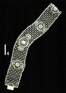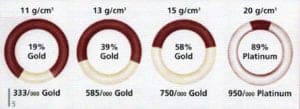The metal granules gained from the platinum soap from Esmeralda were covered ni gold dust and heated to 1,500 degrees Celsius using bellows and a charcoal fire. The gold, which then melted, bonded the platinum granules to each other. When this method was repeated with subsequent cold hammering, it produced metal sheets of significant size, which permitted techniques such as non-chipping deformation, beating or chasing. The platinum content was 55 to 60 %. The gold content 30 to 40 % and where was also a little silver.