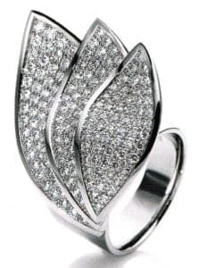 Platinum jewelry was consciously positioned on the German market in an avant garde design style. It should be clearly recognizable and distinguishable from white gold. Matt, silky surfaces, a strict language of firm and pure and clear optics were the philosophy during market introduction. The clamped ring is a perfect example of this. As it was launched, a promise was made that anyone who could succeed in removing a sizeable one-carat stone from its setting could keep the ring. Naturally, nobody managed. At the start of the two-tone age around the mid nineteen eighties, softer jewelry lines were added to the strict forms. Platinum jewelry combined with yellow or red gold has at times advanced to become a main turnover factor in retailing. Since 1994, classic collections have enhanced the designer range in an elegant and feminine design style with diamonds, colored gemstones and pearls. Starting in Europe, platinum provided all continents with important impulses in terms of processing and design.