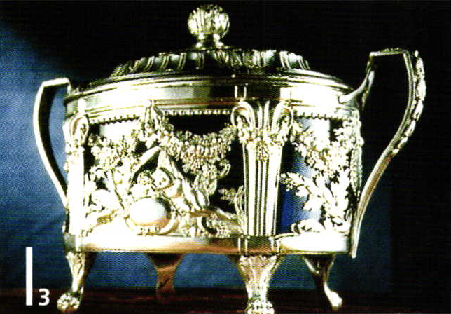 Of Janety's early platinum creations, only one sugar bowl has remained. Another very beautiful piece, a coffee can from his studio, has been missed since the Second World War. According to rumors, an amorous German Major used the proceeds from the requisitioned piece to purchase fine undergarments for his beloved, a street performer in Montmartre. Even today, optimists believe that this magnificent item by Master Janety could be standing in the cupboard as a mistaken alpaca can. The fact that this suspicion is not entirely fantastical can be seen in the example of a small cult mask fashioned by South American Indians in the Museum of Ethnology in Berlin. For many decades, it was believed to be a forgery due to its "silvery coating" on gold. However, just a few years ago, a metallurgy examination revealed that it was indeed platinum.