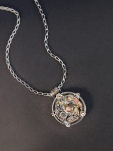 In a piece like her stunning Relativity Navigator pendant, the negative spaces act as windows through which can be seen a patinated 23k gold finish on the inside bowl of the pendant. The filigree elements of this piece also rotate independently of one another, so that the view through those negative spaces changes.