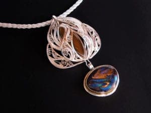 If you've been thinking about trying your hand at filigree work, the good news is that the tools required are quite minimal. "Pliers, tweezers, a steel bench block, a flex-shaft, and sharp scissors," Lansford says. "My go-to tools are round nose and chain nose pliers. Those, and really good tweezers. I bend the frame wire with pliers, but for the small filler wires, I use the tweezers."