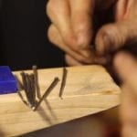 All my blades are made of piano wire, aka drill rod.This is a water-quenchng, high carbon-steel, which is available in the metals rack of many hardware stores. It comes in round, 3 foot lengths of varying diameters. I like it because it is a consistent material, it can be worked with a minimum of forging skills, and it keeps a good edge. The carving tools are of 1/16″ to 1/8″ diameter stock set into 3/8″ doweling. Thinner rod offers more visibility when you are working and requires less grinding down to size. The hot tools are of 1/8 o 5/32″ rod.The heavier material holds the heat longer.
