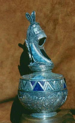 | This photograph shows the pottery and the lid. Once the wax is turned the design can be engraved into the surface of the wax. |