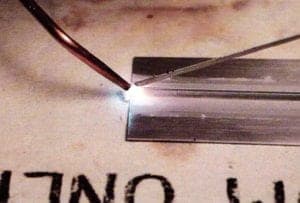 The third means that I tested was metal inert gas (MIG) welding. Small MIG welders were available for about $200, making them viable in my search for affordable technology. They appeared to be toy-like machines that boosted the ability to weld ¼-inch steel, stainless and aluminum on 110-volt, single-phase wall current. The Uno MIG was a great little welder, with a few parts to assemble and a small but useful manual. It was easily assembled and loaded with a 1-pound spool of 5356 filler wire. Most of its functions were self-explanatory and well documented in the manual. A rheostat and four-position switch controlled the wire feed speed and power output respectively. They provided a range of power and feed speeds well suited for welding aluminum. One-pound spools of a variety of filler alloys were easy to obtain, as were replacement tips, a couple of which burned up in the learning process. A second collar was purchased specifically for aluminum to prevent possible contamination when welding other metals. Pure organ was used as the inert shield gas.