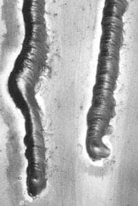The welded samples were sectioned in order to test the effects of long and short anodizing times. The standard sulfuric acid anodizing process was unaltered. The aluminum was first etched in caustic soda. At this point the crucial color match of the seam and parent metal could be evaluated, the seam often appearing slightly darker than the parent metal. Core was taken in working with these baths regarding adequate ventilation and the use of eye protection, rubber gloves and a respirator. The nitric dip seemed to remove the gray film that developed in the caustic soda. At this point, however, it was advantageous to use a soft brush and cold water to fully remove the gray slurry.