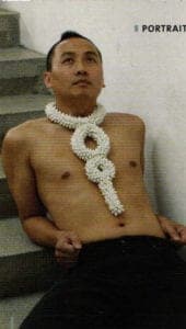 His latest project is a work which uses paper. Here, the artist wears one of his own ostentatious paper chains