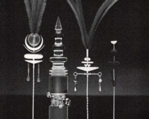 In 1978 during a trip to Australia Ramshaw began to incorporate decorative additions of emu feathers and ceramics into her jewelry. These softer materials caused the work's geometric silhouette to soften and its imagery to become more primitive, even aboriginal. Several pieces shown here represent this whimsical and more carefree delineation. Even her line studies turned away from the technological inclination which had here-to-fore dominated her work. With white ceramic Ramshaw began to create soft geometric forms. In Large Disk on a Hoop, for example, pink and white Jasper floats on the shoulders of the wearer.