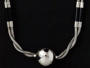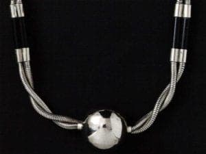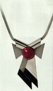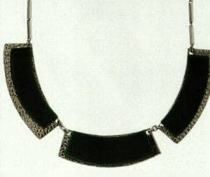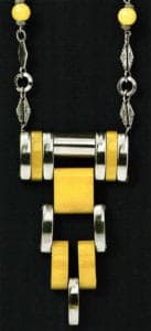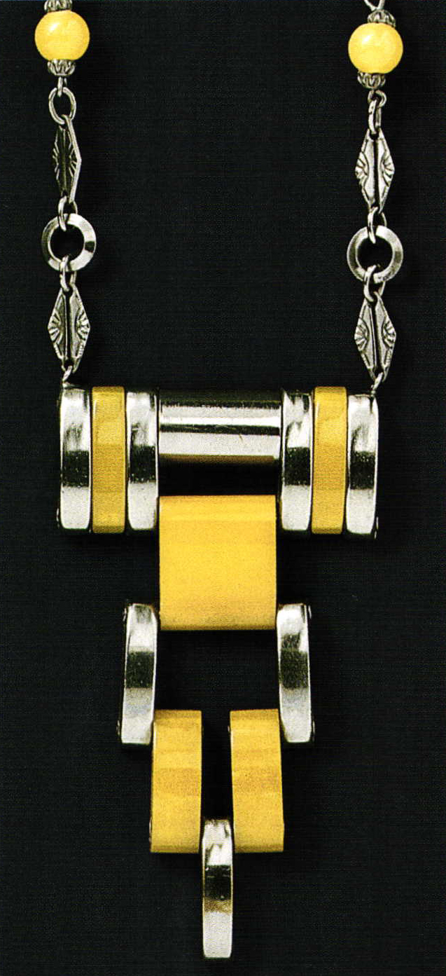 During the nineteen twenties, Auguste Bonaz, a French merchant, was one of the first to produce unusually beautiful chains and brooches made of galalith, chromium and bakelite. In Germany, the production and processing of galalith blossomed, especially in the metal ware factory of Jakob Bengel in ldar-Oberstein. From 1924 onwards, the factory produced chromium-galalith jewelry in the highest artistic quality, which developed to become a top seller in the wake of Chanel's costume jewelry trend. At the time, Jacob Bengel was particularly expert in the aesthetic combination of galalith with the industrial material chromium, which was also fairly recent at the time. Cool chromium with its silver-grey sheen was juxtaposed with the soft, matt glow of the vivid plastic galalith. All kinds of geometric elements made of galalith were contrasted with the chromium-plated chain parts: circles, spheres, skittles, triangles, rhombi and cylinders in finely coordinated colors or skillfully chosen contrasts were turned into items of jewelry that were tailor-made to suit the demands of fashionable women. Simplicity and clarity were characteristic in terms of both design and in the technical processing of the galalith. The so-called "brick tile chains" were typical of the Bengel production; their numerous rectangular, small, overlapping and entwined links joined together to form a tile-like pattern. Some of the links were painted on both sides in different colors, so that the wearer could simply turn the chain over to achieve a different effect.