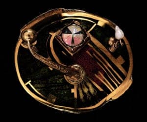 Harper has brilliantly condensed these two Kali myths in his circular mask/brooch and incorporated the Shiva lingam symbol as well' Surrounded by a rim of gold, Kali's disc face is the incandescent red of bicycle reflector plastic; her black-rimmed eyes are moonstones; her mind's eye is an opal. But a pearl-tipped lingam of crudely modeled gold emerges from her golden mouth, formed by Harper into a yoni, the triangular symbol for female genitalia. Hence Harper's Kali brooch personifies both male and female principles of creativity and deconstruction, of life and death.