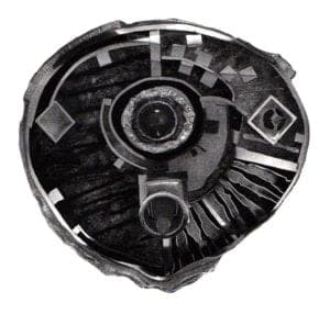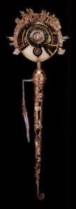 Harper's Grotesque Self-Portrait of the Artist as a Haruspex, for example, suggests that the artist creates by a process of self-evisceration. (A haruspex was a Roman seer who read the future in entrails.) The complex ridges of a fossil shell spill out from the open chest of Harper's long, thin figure; its gold mouth grimaces and its jeweled eyes droop heavily as in pain. But the glowing scarab carapace on the Haruspex's forehead symbolizes the visionary powers of the mind. A brooch, and a very beautiful one at that, the Haruspex also demands recognition as an expressive work of art, one that conveys the dichotomy between the pain of introspection and the ecstasy of revelation that lies at the heart of the creative process.