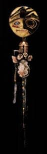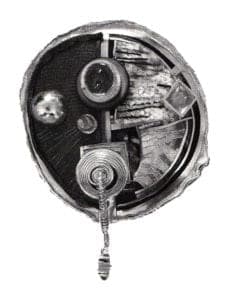 Harper's use of phallic and vaginal symbols is only part of his investigation of what makes a small object potent. The idea of spiritual power has virtually vanished from Western jewelry, although there are echoes of it in the folklore of gemstones. But it is still very much present in Africa, where people wear amulets and charms for protection from evil and for the working of magic. Harper started collecting African art as early as 1967. He was particularly impressed by Congolese fetish figures - wood sculptures bristling with nails, razor blades and other sharp objects, pounded in as part of community rituals to bind contracts and transfer evil influences to the figure. It struck Harper forcibly that the intrinsic linkage of good and evil in a single icon had a good deal to do with the icon's aura of power. He decided that the combination of extremes and dichotomies would be the structural principle of his art. Again, the assemblage art of Africa served as a model, demonstrating how a rich series of conceptual opposites could be brought together in one powerful iconic piece.