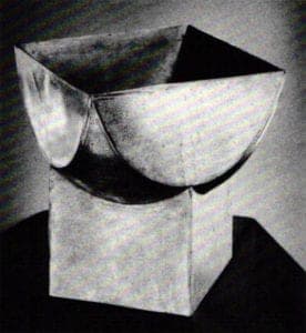 This sense of malleability also appears at the junction of the cubic base and hemispheric bowl. The corners of the cube are peaked. Between them the top edges of the walls are slung parabolically, as though the bowl had simply shaped, even melted, its own nest out of the underlying block. These small details of accommodation not only permit the cube to serve quietly as a base, but they describe the efficient union of the two forms.