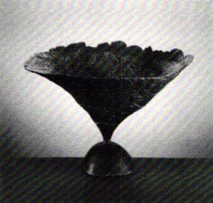 William Underhill was one of the few artists who used the foundry to make pots. The process was plain. He would throw a thick-walled clay vessel on the potter's wheel, model its interior surface, then coat it with wax and cast that wax shell in bronze. This method, in effect, turned the clay pot inside out. Indentations and incisions in clay appeared in relief on the surface of bronze. The results were highly embellished, almost ritualistic, textures on organic forms. In the 1962 "Young Americans" exhibition of the Museum of Contemporary Crafts,