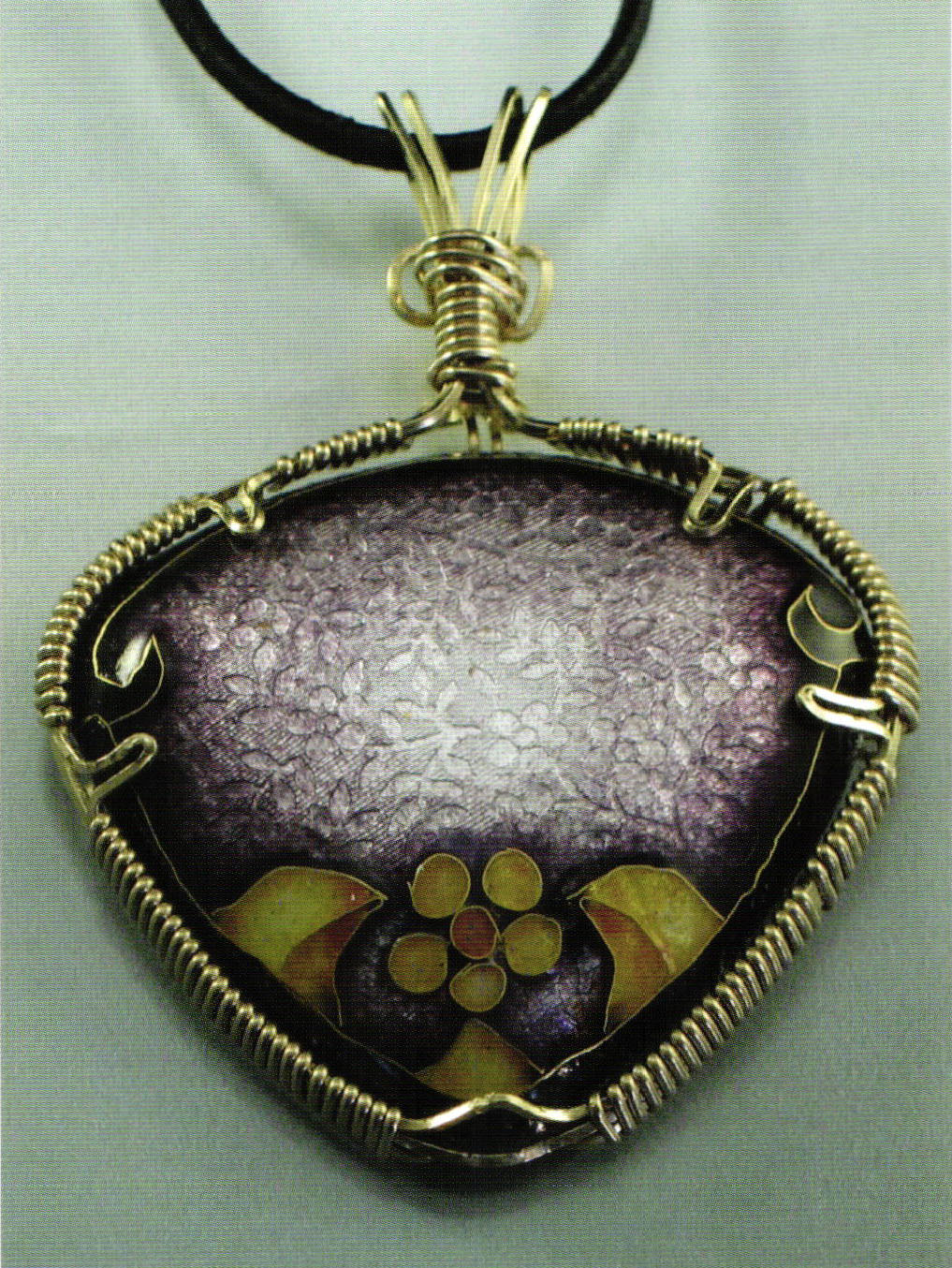 | Purple Gold Cloisonne Pendant Gold cloisonné Three wires, bail on top, whole wrapping with prongs. |