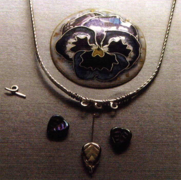 | Pansy. Cloisonne enamel Argentium silver Photo shows construction of bezel with wired "loops" for supporting additional elements |