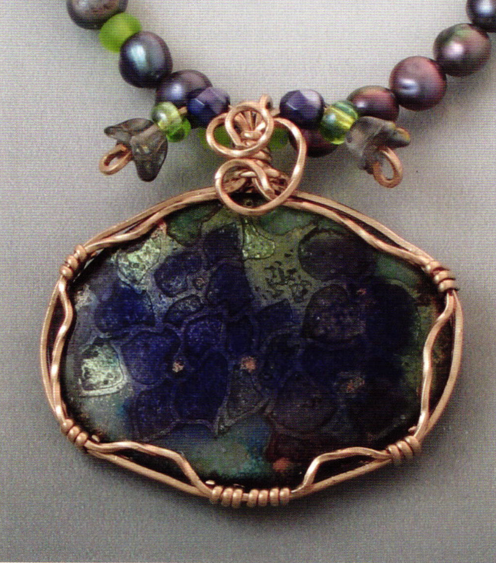 The goal is to cover the edges of the piece with wire and bring them together at a 45° angle at the top center. Wrap segments with half-round wire at the appropriate spots. Bend wire supports inward on both side to hold the enamel piece securely. At the end, create a bail with the ends of the wire bundle, to be able to attach a necklace. Temporary binding wire as well as tape are needed for this process, and wooden dowels might aid in the forming along the way. Good wire end cutters, round nose and flat-nose jewelry pliers, and pen knife are all the tools needed.