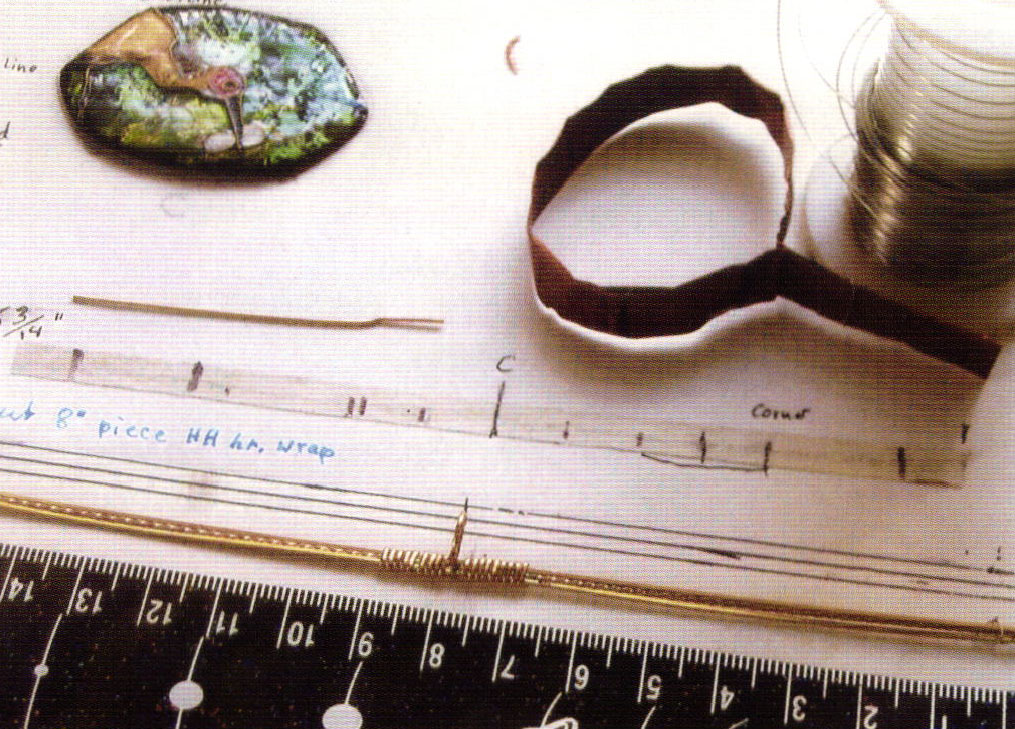 Now measure the circumference of the piece with narrow tape which represents the length of my wire, straighten it and add 1 ½" more for each end (3″ longer than the circumference). Cut 3-4 wires and lay this 'bundle' on the table, marking the center. Twist one or two wires for extra interest. Wrap them with temporary binding wire. All markings for secure points should be made at this time, on the tape and on the wire. See step-by step pictures for earrings and Crane Love below.