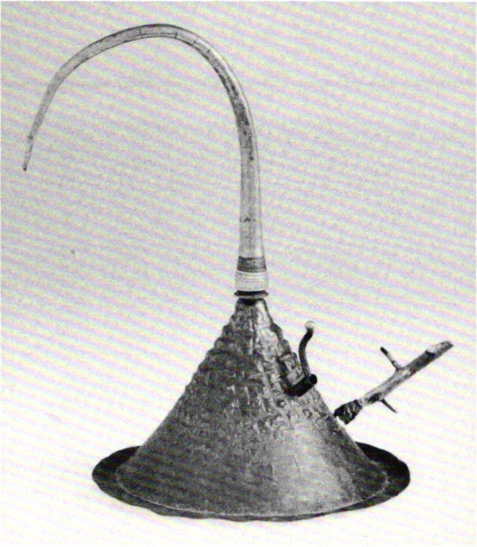 In form, the steamer is simply an inverted funnel with a long gooseneck spout, rendered with humorous associations to oil cans and rural stills. The fabrication is bare minimum handiwork, with crimped base and hammered vessel. There is no attempt to finish the piece—a signature Noffke effect that challenges the viewer as to its ultimate intention. The material is base metal, copper, though Noffke has manufactured one out of silver for exhibition—a jab at preciousness.