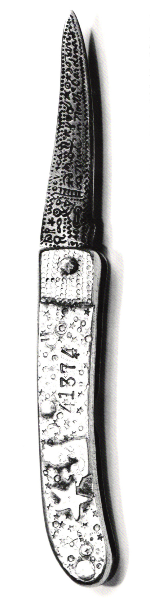 Noffke's early metalwork sacrificed form for the sake of ornamentation. He attacked the metal relentlessly. Stamping, piercing, chasing and engraving covered everything from necklaces to knives. He used the form of commonplace objects as a come-on, suckering viewers into the complex, diminuitive world of his personal iconography. Ironically, however, his text was opaque and noncommunicative. While traditionally, decoration is used to augment forms that are restrictive in the amount of information they carry, with Noffke the decorative surface is legible, but, on closer inspection, it becomes more chaotic and incoherent, a secret code of ciphers an cryptographs.