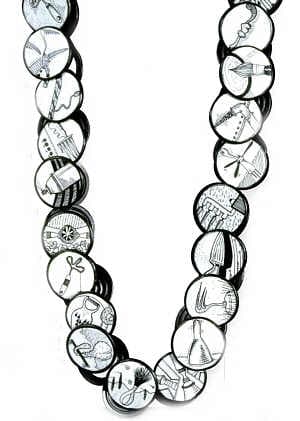 ![]() | Tool (necklace), 2000 (detail) Sterling silver, copper, 18k gold, pen on paper Diameter 18″ Photo: Keith Lewis |
