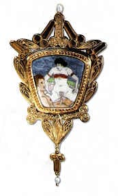 Before that 2002 mea culpa, Lewis produced another dozen or so pins tracking the spread of AIDS among friends, dedicating memorial works to them, and exhibiting in the sympathetic San Francisco Bay Area (the site of his best reviews). Pride, rather than guilt, might be a more appropriate, if less opportune, emotion for the artist. Enhanced workmanship and potent animal surrogates (a rooster, a bear, a shrimp, an elk) make these pins among the best of the survivor guilt series. Bath Time (1995), for example, uses a golden bear to satirize portly middle aged gays at a steam bath (and virus infection site), while Salt Lick (1996) adds real diamond semen droplets to the gold over silver six pack torso, enriching the artist's most explicit image yet of masturbation. Together, they take the notion of male brooches as icebreakers or conversation starters to another extreme: art as the surrogate pick up line in a bar. A Lewis pin on a man says, "Get closer and have a look." But could these outrageous ornaments ever really "encourage a change in societal attitudes," as one curator hoped?' Not likely. No more so than Judy Chicago's Dinner Party did or Andres Serrano's Piss Christ.