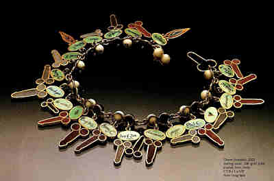 | Charm (bracelet), 2002 Sterling silver, 24K gold plate, enamel, horn, bone 7 7/8 x 1 x 1/8″ Photo: Doug Yaple |