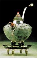 I liked the idea of having precious materials hidden inside." The spout is made of two different varieties of stone. The base stone is granite, the second stone is a material that Boyd speculates is a type of jasper. Dangling from the spout is a piece of silver tubing with silk emerging from it like a tassel. South African bustamite is used on the bottoms of the feet. Finally, the pot is placed on a tray of silver with a serpentine rim, which Boyd fashioned from a serpentine bowl. "Again I'm taking materials, like forms and shapes, and chopping them up. My pieces might as well be a mosaic or a collage. My objects are more like a 3-D collage."