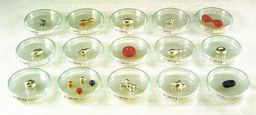| Cells, (brooches), 1999-2002 silver, gold, copper, resin, neodymium, magnets, glass petri dishes 18 x 12 x 1″ |