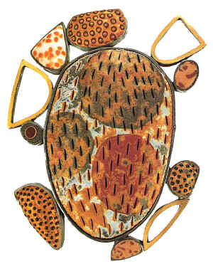 Steven Ford and David Forlano have clearly left the world of polymer clay behind, and not only because of their increased use of metal. Ford paid his professional dues through teaching and serving as president of the National Polymer Clay Guild. But in a world where projects such as "Bug Buddies" and "Silly Snakes" are offered in books, there is little loom for the aesthetic choices they have made. They have used polymer clay for its best qualities-almost limitless texture, form, and color-to create wearable and exciting jewelry. Unconcerned with hiding or disguising the fact that they use polymer clay, they want their audience to respond to the design and not the material, so that after a moment the buyer returns to say, "By the way, what is that?" Like resin artist Peter Chang, whom they admire for his continued ability to confound and delight, they too have transcended their medium.