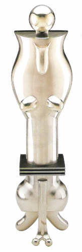 This history forms the deep background of Muir's vessels. Muir's design motifs have ranged from medieval mace to nurturing hand to natureinspired spirals and leaves. He commemorates the tradition that produced them, recalling them as commonplace objects that are recognized even if they're no longer in everyday use, He uses the ideal of an elegant silver coffee server to create a bawdy, sexually ambiguous vessel in The Definition of Is (2000), linking an old-fashioned form with one of America's most embarrassing moments, the Clinton-Lewinsky debacle. Its sexualized contours hint at escapades lurking in the best of homes. More than one of Muir's vessels intimates the moment of sexual differentiation, or androgyny. In choosing a provocative title, Muir threatens to undermine the seriousness of his intent. Viewers may fix on the deception, either than, as Muir intends, the immanent. By this he means "the moment when sexual principles come into the universe and there is an awareness of being that is erotic." In this case the title, though amusing, is a little misleading.