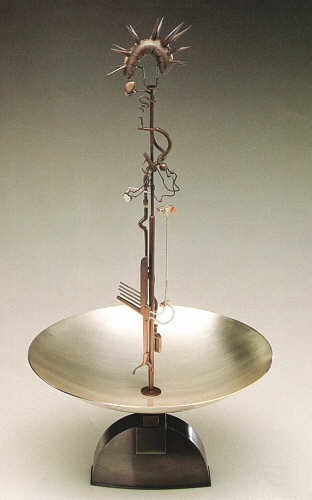 Muir's 1994 entry in "Design Visions International: Directions in Class, American Jewellery and Metalwork , Australia " is illustrative. In the Tazza (dish), a twisted Nine topped with a spiky caterpillar emerges from a satellite dish that is itself embellished A with a tuning fork, as if Jack's beanstalk culminated in an insect from outer space. At the time, Muir was teaching at the Center for creative Studies in Detroit (now the College for Creative Studies), which gave commentators Sarah Bodine and Michael Dunas reason to call Muir "a boulevardier from Detroit" and to frame his choice of holloware in terms of the many possibilities inherent in the larger format.