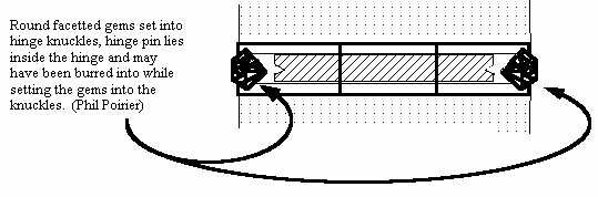 An example of how this kind of thinking is applied can be seen in this design sent to me by Phil Porier. He has used a hinge pin just shorter than the hinge itself on each side and then tube set faceted round gems into the ends of the hinge. I might recommend starting with the outer knuckles a little wider than the width being hinged: this to allow for metal removal during setting.