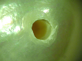 Overaggressive drilling has damaged the nacre on this pearl.
