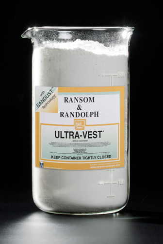 Bandust is not a new type of investment powder, but rather a substance added to Ransom & Randolph's gypsum-based investments that binds the small particles to the investment material, thus reducing respirable dust. Developed in the Netherlands for the dental industry by Ransom & Randolph's parent company Dentsply and used primarily in Europe for about 10 years, Bandust technology was tailored for use with jewelry investments and perfected over the past year. Ransom & Randolph first tested Bandust in-house in its Ultra-Vest investment, experimenting with the material in the company's facilities in the U.S. and Germany. It then sent the modified Ultra-Vest out to an independent industrial hygienist for verification. All tests showed that the product significantly lessened respirable dust.
